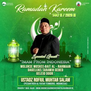 Net als vorig jaar hebben we opnieuw de eer om imam Ustadz Rofiul Muhtar Salam uit Indonesië te verwelkomen, een Ḥāfiẓ al-Qurʾān die ons zal leiden tijdens de tarāwīḥ en andere gebeden. Zijn prachtige recitatie helpt ons de woorden van Allāh met meer rust, aandacht en khushū‘ te beleven, inshāʾAllāh.