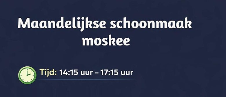 Onze maandelijkse grote schoonmaak staat weer gepland, voor het gehele jaar, insha Allah! Samen zorgen we ervoor dat onze moskee een schone en fijne plek blijft voor iedereen. Alle hulp is van harte welkom!