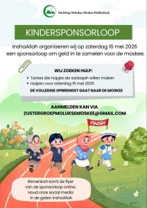 Insha Allah organiseren wij op zaterdag 16 mei 2026 een kindersponsorloop om geld in te zamelen voor onze moskee. Met deze activiteit willen we onze kinderen op een leuke en actieve manier laten bijdragen aan een goed doel. De volledige opbrengst gaat naar de moskee, en elke bijdrage, groot of klein maakt verschil.
